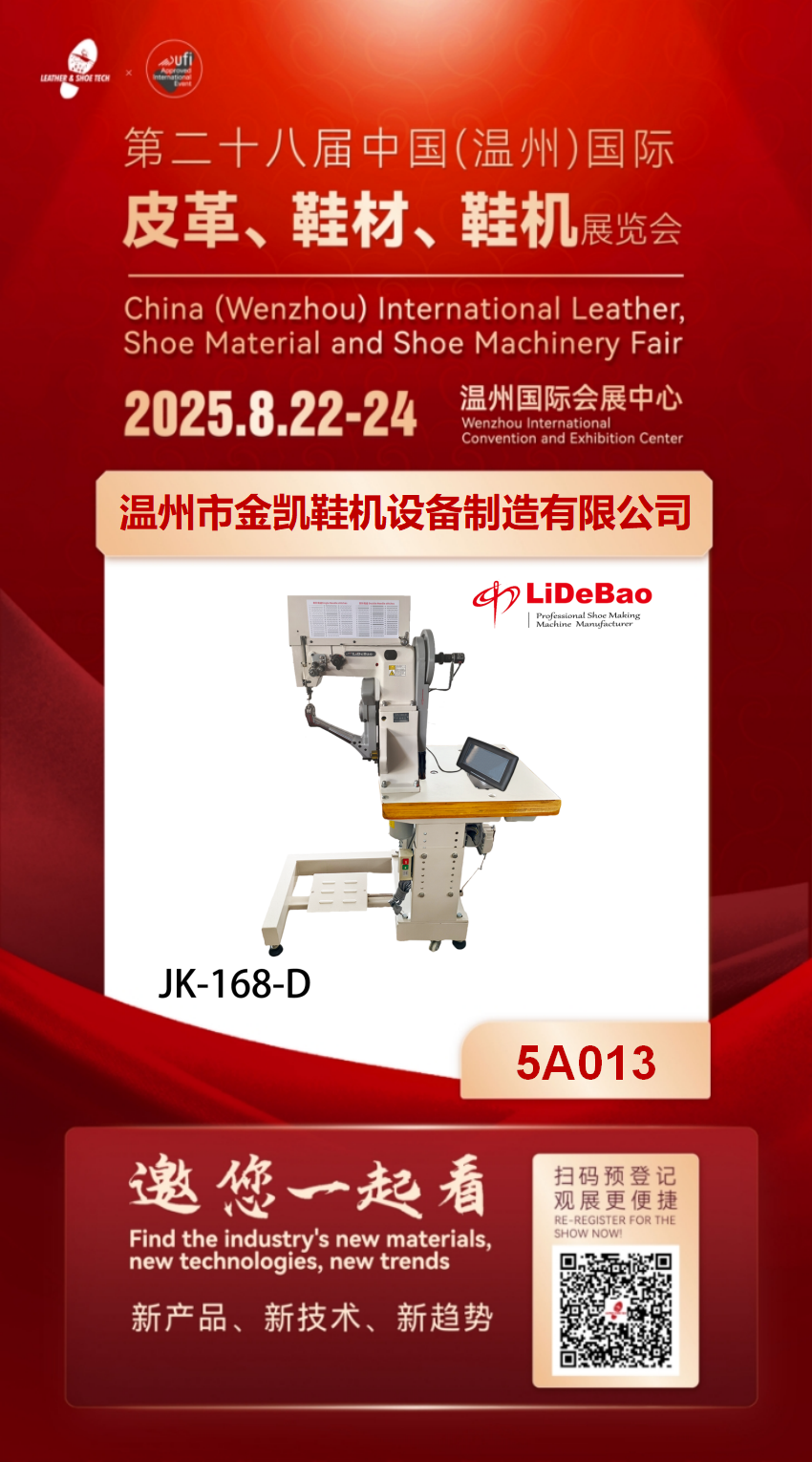 Lidebao está actualizando tres de sus productos este año. La primera es la máquina de coser suelas de paredes laterales con patrón JK-168-D. Puede coser 100 diseños, ampliando sus posibilidades de diseño de calzado. La segunda es la JK-161, máquina de coser suelas de paredes laterales, puntada de cadeneta. Pasa del avance del prensatelas al avance de la aguja y del prensatelas, mejorando la estética de la puntada. El punto de cadeneta elimina la necesidad de cambiar las bobinas, lo que lo convierte en una gran ayuda para coser pantuflas desechables. El tercero es el JK-05-8, que presenta un nuevo mecanismo de transmisión, cambio de patrón controlado por motor y un tensor de hilo neumático, ¡lo que hace que la operación sea aún más conveniente! Lidebao le da la bienvenida al stand 5A013.